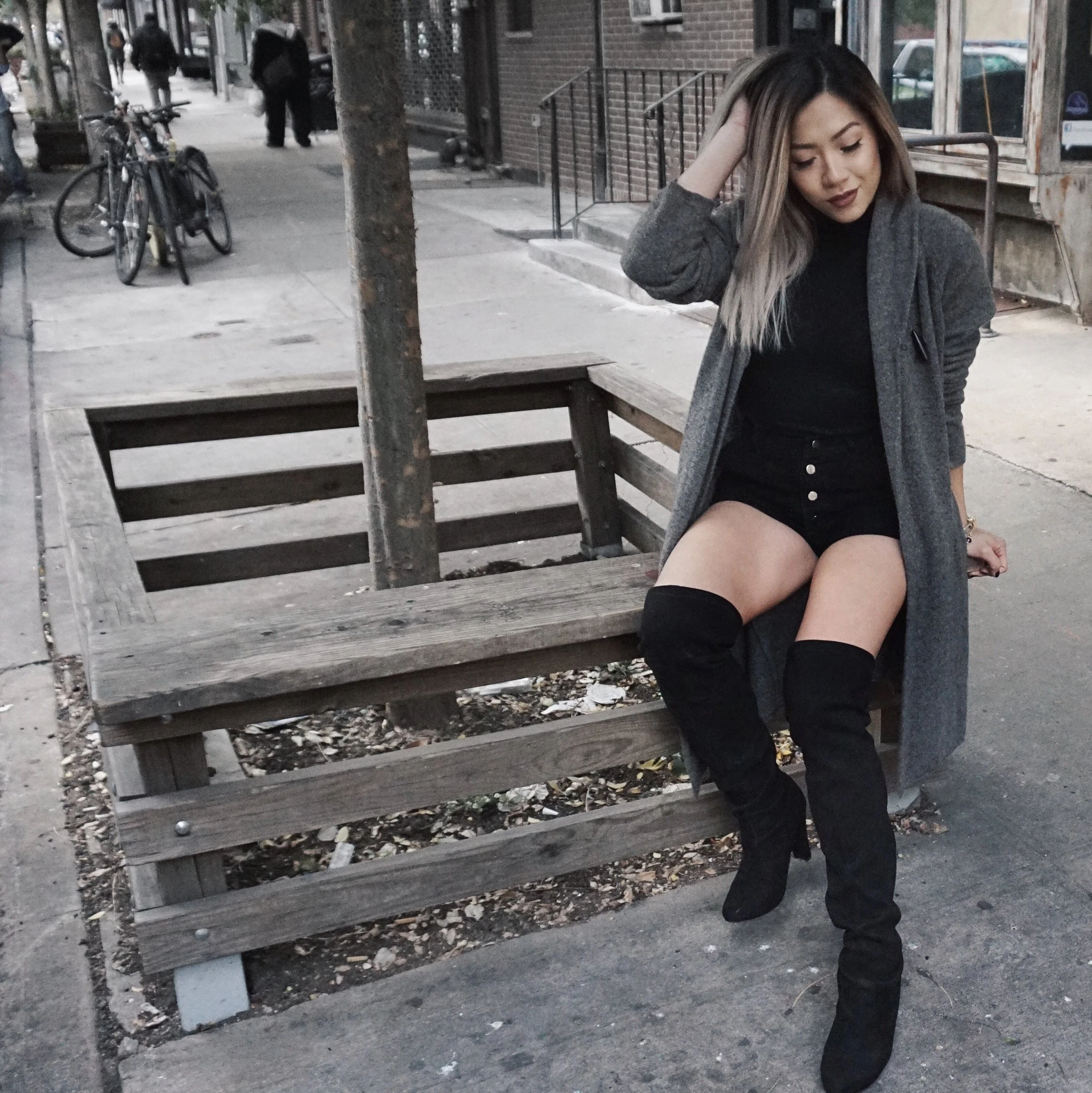 HELLO THERE!  Well I have pretty much abandoned the color from my wardrobe.. can you blame me it freaking gets dark at 5pm now! LOL. But I am seriously black and grey have been dominating my outfits lately, so today I am sharing with you this cute and easy outfit ft the oh so very popular and trendy button up shorts!